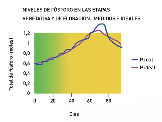 Además, será necesario proporcionar los niveles de elementos requeridos por la planta en cada momento para mantener el equilibrio entre ellos. Por ejemplo, la necesidad de fósforo de la planta aumenta durante las primeras etapas del ciclo de floración, y aunque después disminuya un poco, el cómputo global es que la necesidad de fósforo de la planta habrá ido aumentando durante todo el ciclo de desarrollo de esta. A este hecho se le conoce como la Curva de Absorción del Fósforo, un gráfico de una curva de Bell modificada. El único fósforo adicional que un cultivador necesita añadir es el que el fertilizante principal no contiene, lo cual variará con el tiempo; de nuevo, el juego de las proporciones. La planta modificará el entorno del área radicular para favorecer la activación de fosfatos y así poder absorberlos. La necesidad total de fósforo en el área radicular estará basada no solo en las necesidades de la planta, sino también en el nivel de actividad que tenga el medio con respecto a la disponibilidad de fosfato.
